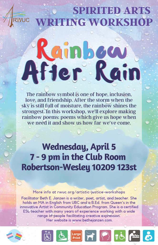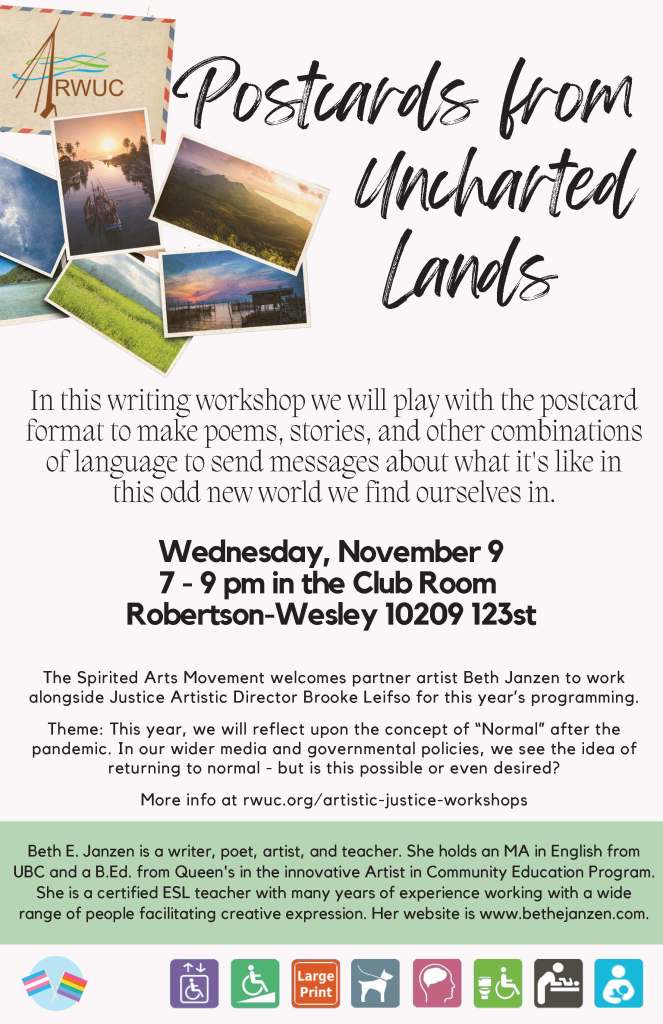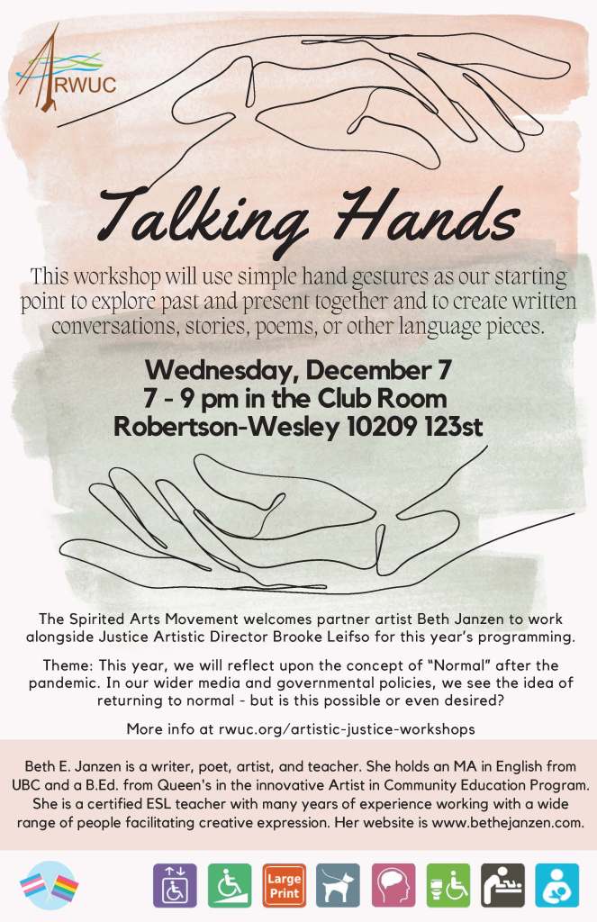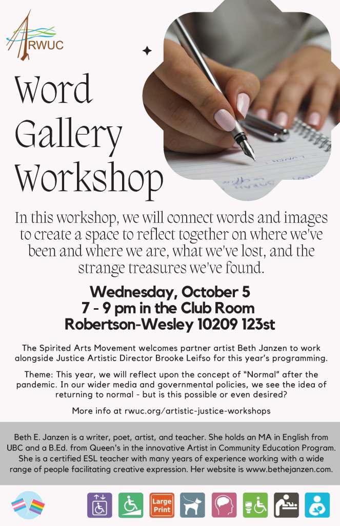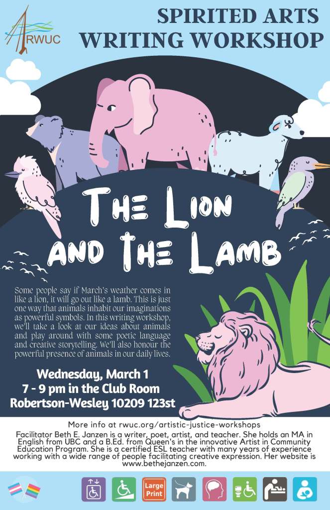 Spirited Arts Workshops November 17, 2023 Written by Beth E. In fall 2022 and winter 2023 I had the pleasure of co-facilitating (with Brooke Leifso) in person writing workshops as part of the Spirited Arts Movement at Robertson-Wesley United Church. 2023 Workshops 2022 Workshops